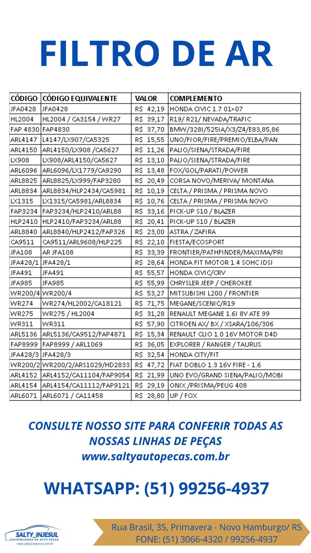 R$ 13,48 - FOX/GOL/PARATI/POWER